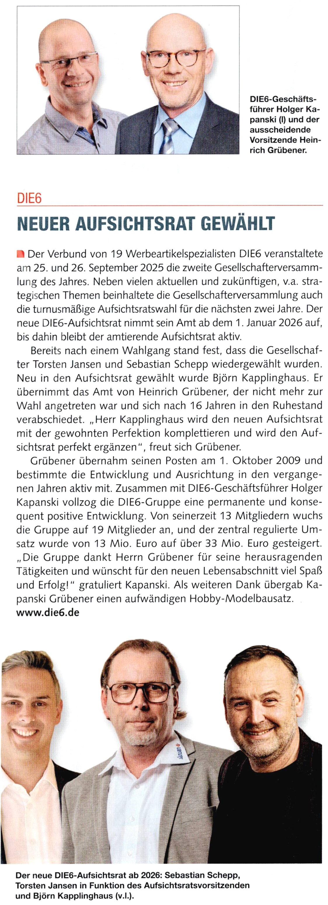 Im DIE6-Pressearchiv finden Sie zahlreiche Artikel und Informationen vom und über das Profi-Netzwerk der Werbeartikel-Unternehmer.